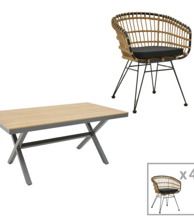 Naoki-Thorio dining table set of 5 anthracite aluminum and plywood in natural shade 160x90x75cm