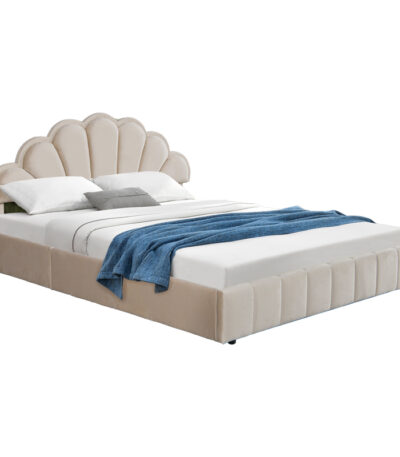 Mago bed, cream fabric with natural wood leg, 160x200cm