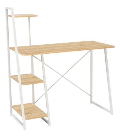 Канцелариско биро со полици Декстор во дабова боја со бели метални ногарки 102x50x117 см