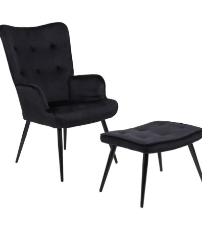 Фотелја со табуретка Siella црна сомотска - црна метална ногарка 59x67x94 см