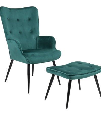 Фотелја со табуретка Siella темно зелена кадифена боја - црна метална ногарка 59x67x94 см