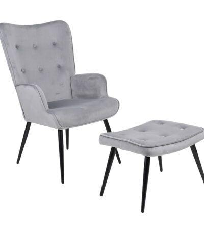 Фотелја со табуретка Siella сива кадифена и црна метална ногарка 59x67x94 см