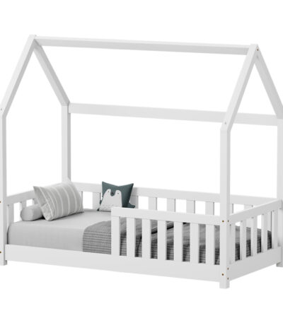 Детски кревет Bambie со ограда од борово дрво од типот Монтесори во бела нијанса 70x140 см