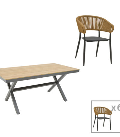 Трпезариска маса Raven – Thorio сет од 7 антрацитни алуминиумски и иверица во природна нијанса 160x90x75 см