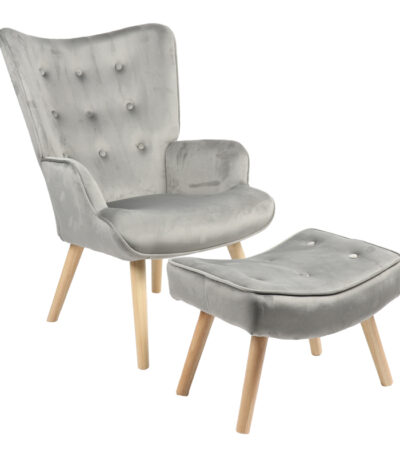 Фотелја со подножје Vivienne од кадифена ткаенина сива-природна ногарка 75x69x96 см
