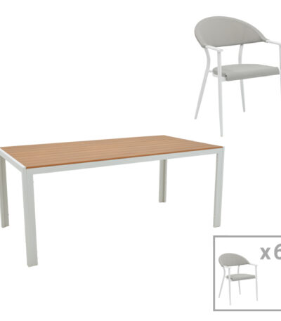 Трпезариска маса Nares-Pino B сет од 7 бели алуминиумски и иверички во природна нијанса 180x90x72.5 см