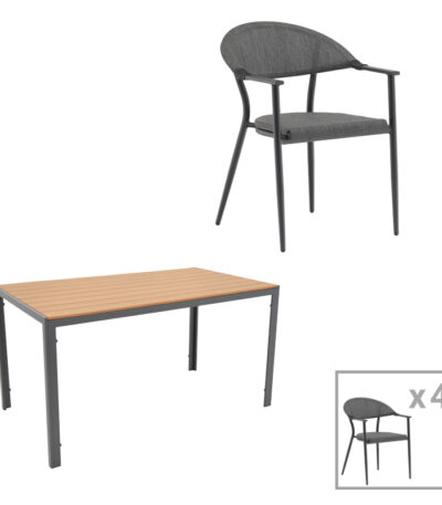 Трпезариска маса Nares-Azelie C сет од 5 антрацит алуминиум и текстилен со иверица во природна боја 140x80x72.5 см