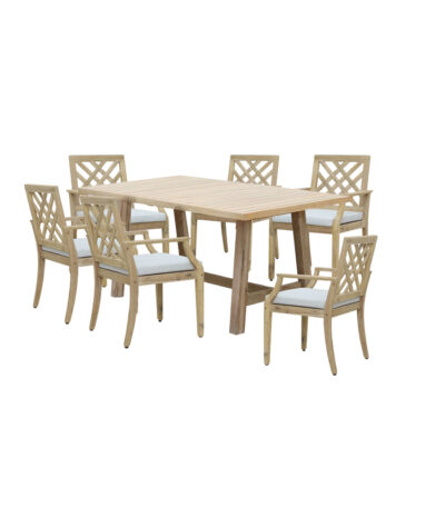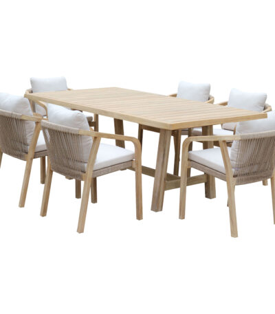 Трпезариска маса Поза-Фарем 7 парчиња масивно дрво акација-еукалиптус-беж материјал
