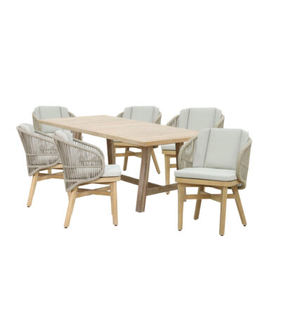 Трпезариска маса Поза-Малибу 7 парчиња цврсто акација дрво-беж ткаенина