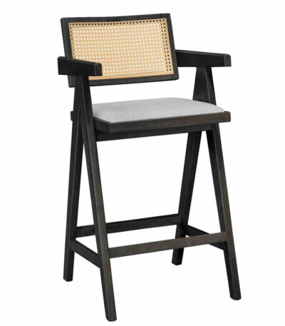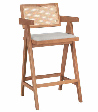 Барска столица со рачки Винслоу дрво гумено дрво светло орев-пвц ратан природна-сива ткаенина