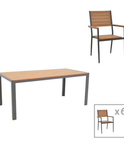 Трпезариска маса Nares-Raven сет од 7 антрацитни алуминиумски и иверица во природна нијанса 180x90x72.5 см