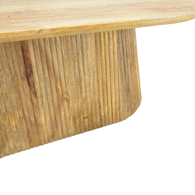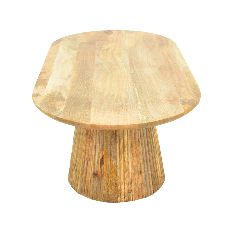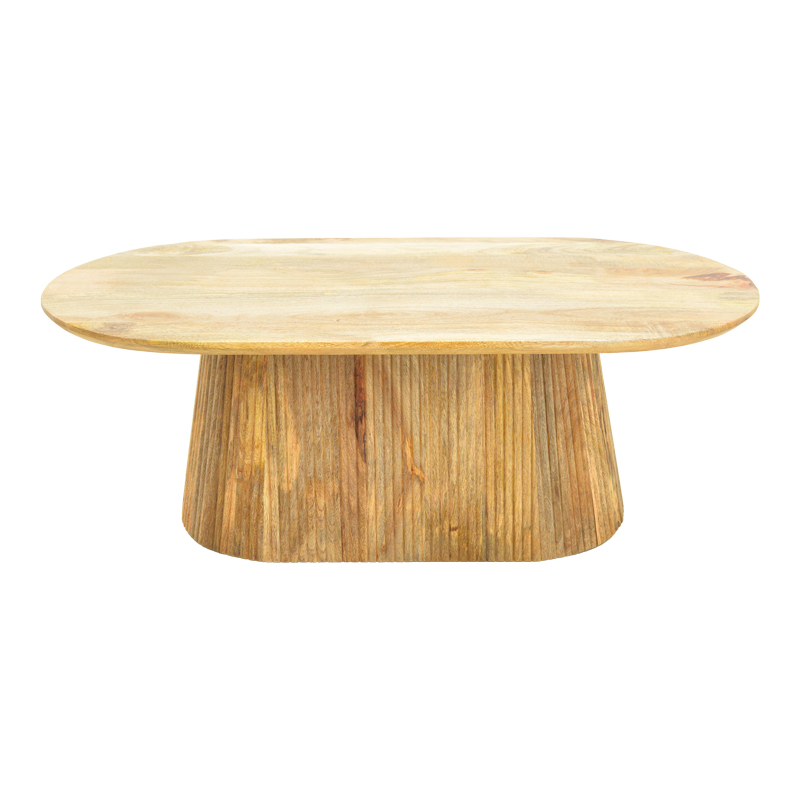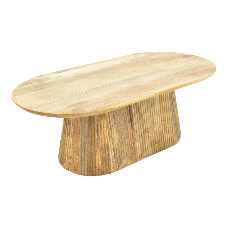 Aithra coffee table made of solid mango wood, featuring a modern design and natural aesthetic. Its oval tabletop highlights the unique texture and grain of the wood, adding warmth and elegance to any interior.