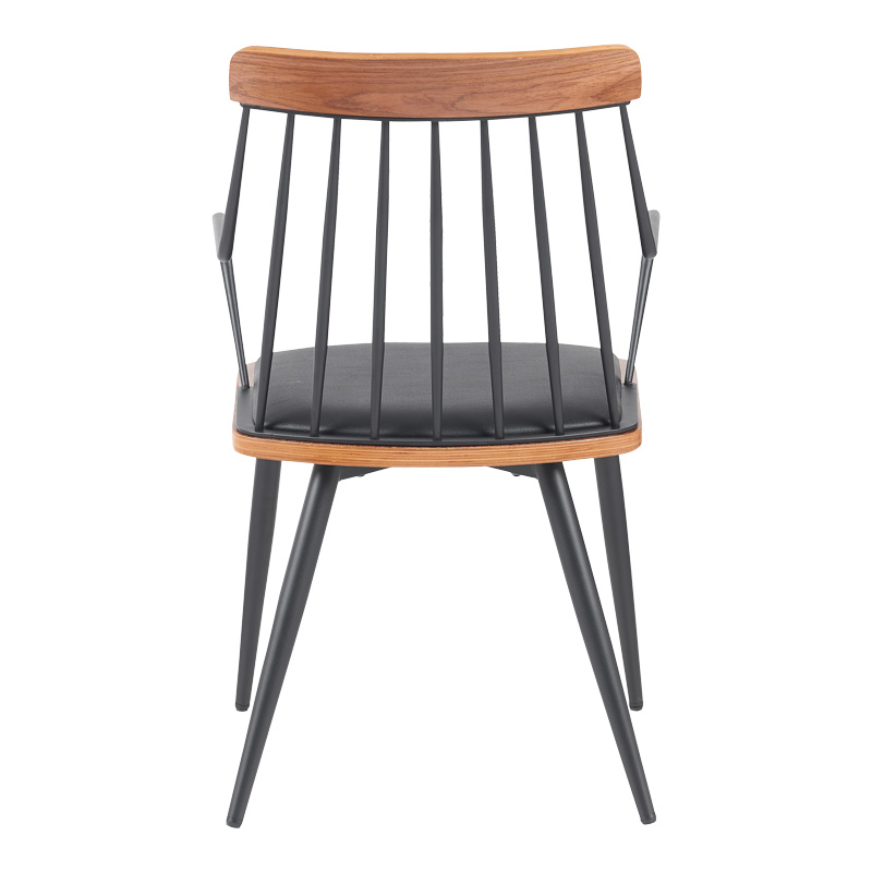 It features a comfortable, slim seat cushion framed by a sleek metal structure. The backrest is composed of vertical metal rods that meet a horizontal wooden accent, adding a subtle and elegant contrast. Slim, tapered metal legs enhance both lightness and stability, while the curved metal armrests provide extra comfort and a touch of style.