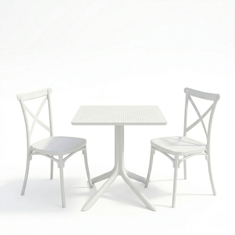 Tradition meets modern living. This set combines the classic cross-back design of the Crossie chair with the industrial perforated style of the Groovy table. A total white ensemble that transforms your balcony or garden into a charming bistro setting, offering excellent durability against outdoor conditions.