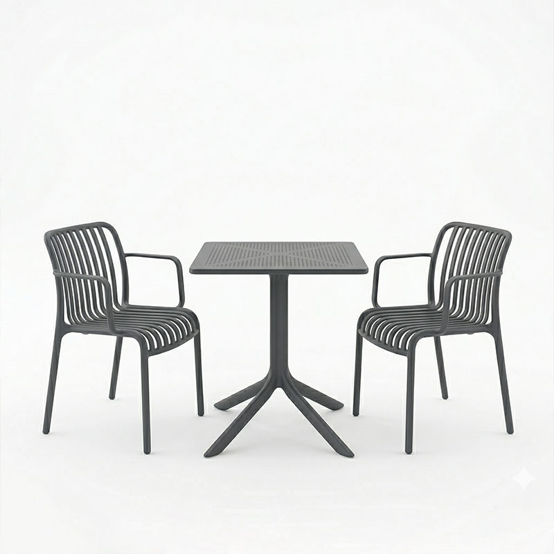 Enjoy your coffee or meal with unmatched comfort and modern aesthetics. This set combines the practicality of a table with the luxury of two comfortable armchairs, creating the perfect relaxation corner for your balcony, garden, or yard.