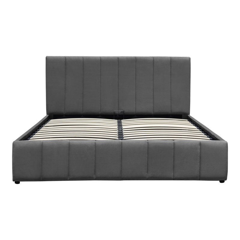 The bed features an easy-to-use mattress lift mechanism, which reveals a spacious storage area underneath. This makes it exceptionally easy to organize linens, pillows, out-of-season clothing, or other items, effectively contributing to the organization and tidiness of the space.
