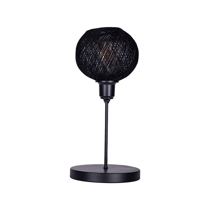 The combination of the minimalist black base with the handmade spherical shade, crafted from woven PP, creates a stunning effect. When lit, the weave casts warm, playful patterns on the walls, offering a unique and relaxing atmosphere.