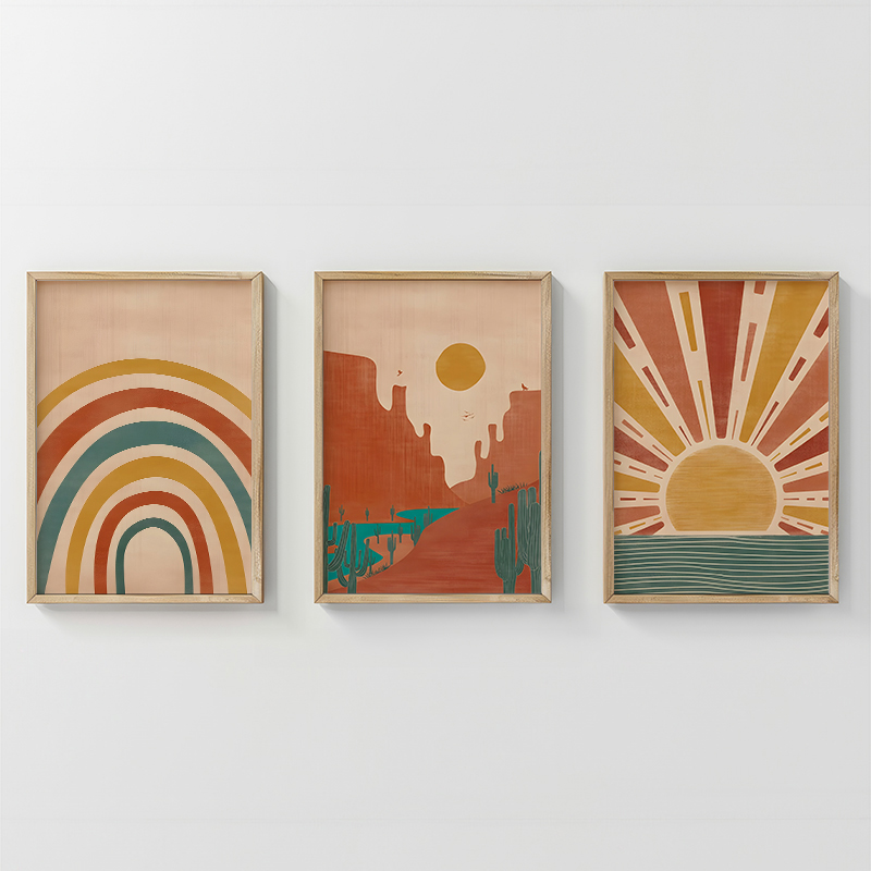 Introduce a cheerful, optimistic atmosphere into your space with a retro touch, perfect for adding warmth and color. The Jecko triptych consists of three distinct, dynamic pieces, all based on an earthy, retro color palette. This triple arrangement brings playful rhythm, a cozy ambiance, and refined aesthetics, making it ideal for bedrooms, children’s rooms, or workspaces.