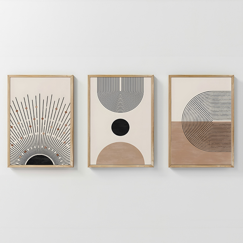 Bring order and simplicity of modern art into your space with the Lagon triple composition. It is an aesthetic statement consisting of three separate, interacting pieces. Each panel features abstract geometric elements. The artwork adds depth, rhythm, and high aesthetic value to the space, evoking symbols of the sun and moon.