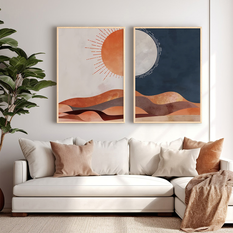 Let the warmth of earthy tones and the primordial calm of the desert fill your space. The Lebrano diptych is not just decoration; it is an aesthetic statement that depicts the cycles of nature (sun/moon, day/night) over a minimal, abstract dune landscape. Every time your gaze falls on the warm terracotta-orange tones and the deep blue, you feel a sense of balance, spiritual calm, and tropical luxury. The artwork symbolizes the eternal cycle, stability, and the subtle charm of modern Bohemian style.