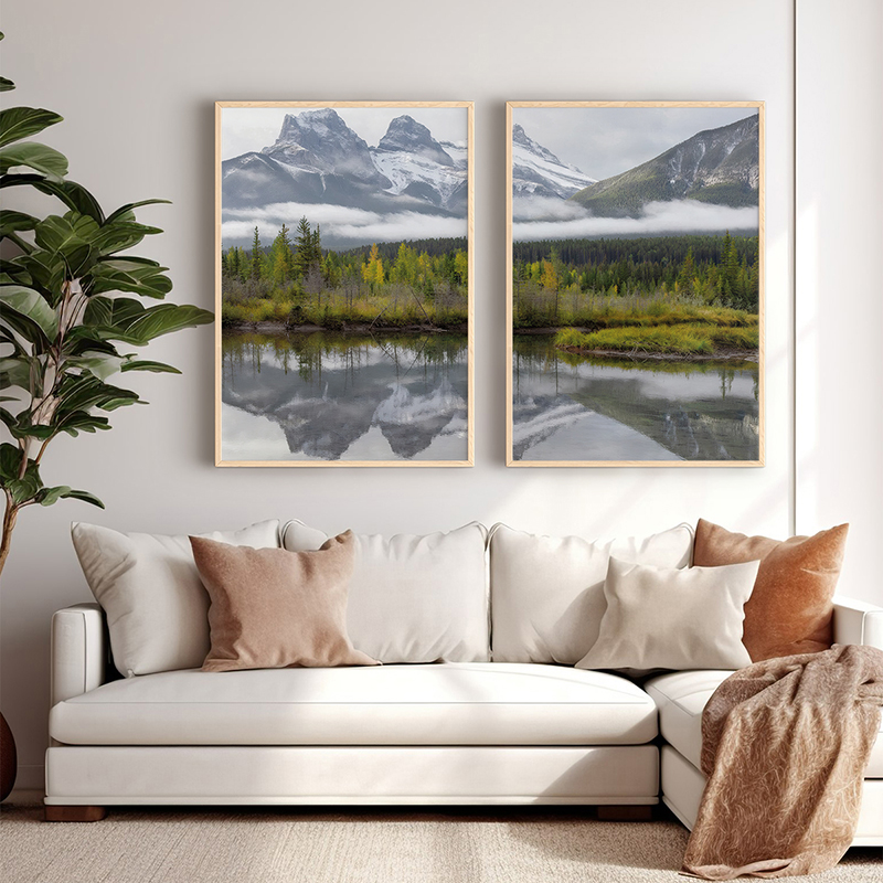 Let your gaze wander into the eternal calm of the mountains and the perfect balance of nature. The Leron diptych is not just decoration; it is an aesthetic statement that represents the grandeur of a mountain landscape and its flawless reflection in a serene lake. Every time you focus on the snow-capped peaks and the rich greenery, you feel a sense of inner peace, balance, and natural strength. The artwork symbolizes tranquility, the perfection of nature, and timeless beauty. It is a visual reminder that luxury lies in the majesty of the natural world.