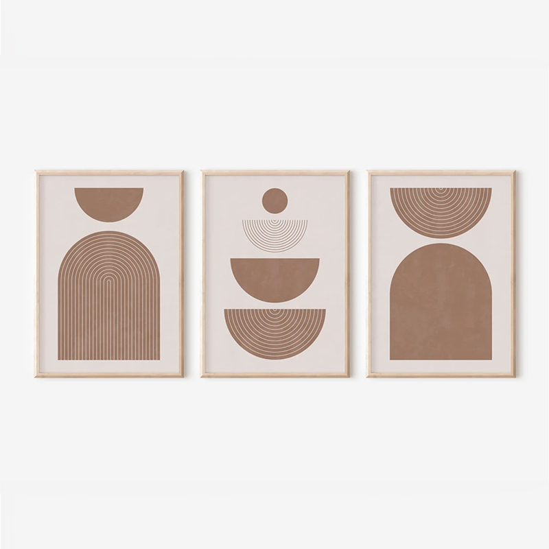 Elevate your space with serene, geometric elegance: the Loana Triptych is the perfect piece to bring a minimalist, architectural character to your walls. This three-piece composition, enhanced with high-resolution digital prints, features abstract patterns with large curves in a soft palette of nude and beige tones. Through their harmonious arrangement, they create a subtle, balanced visual rhythm and a striking aesthetic statement.