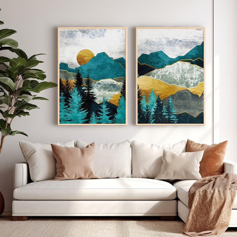 Discover art that exudes bold personality and luxurious aesthetics. The Lovas diptych is a dramatic aesthetic statement representing an abstract, geometric mountain landscape, where the golden sun meets the deep turquoise of the sea or forest. Every time your gaze rests on the striking contrasts and clean lines, you feel a sense of power, renewal, and high-end style. The artwork symbolizes the balance of opposites, elegance, and the subtle charm of modern design.