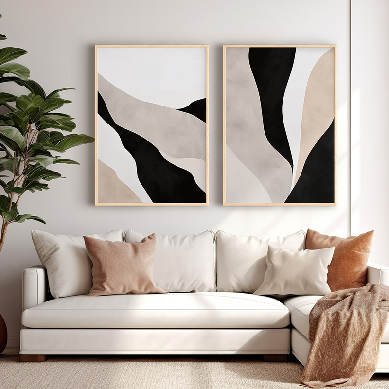Introduce refined movement and subtle contrast into your space, characteristic of contemporary abstract art. The Manua diptych features dynamic, wavy lines and shapes in overlapping layers, creating a sense of flow and lightness. The choice of a simple, neutral palette adds modern elegance and fits perfectly in Minimal and Boho interiors.
