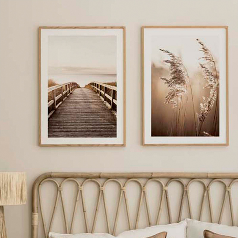 The Neganto painting is an elegant, serene, and minimalist diptych (pair of paintings) that blends landscape photography with contemporary Scandinavian aesthetics. It features two panels with nature-themed subjects in earthy, monochromatic tones: one depicts a wooden pier disappearing into the fog, and the other shows a close-up of dry plants. Classic elements of landscape photography are preserved, while the combination of the two panels in warm beige and brown tones creates a sense of calm and Boho Chic. It is ideal as a focal point above furniture, adding elegance, tranquility, and a minimal/chic vibe.