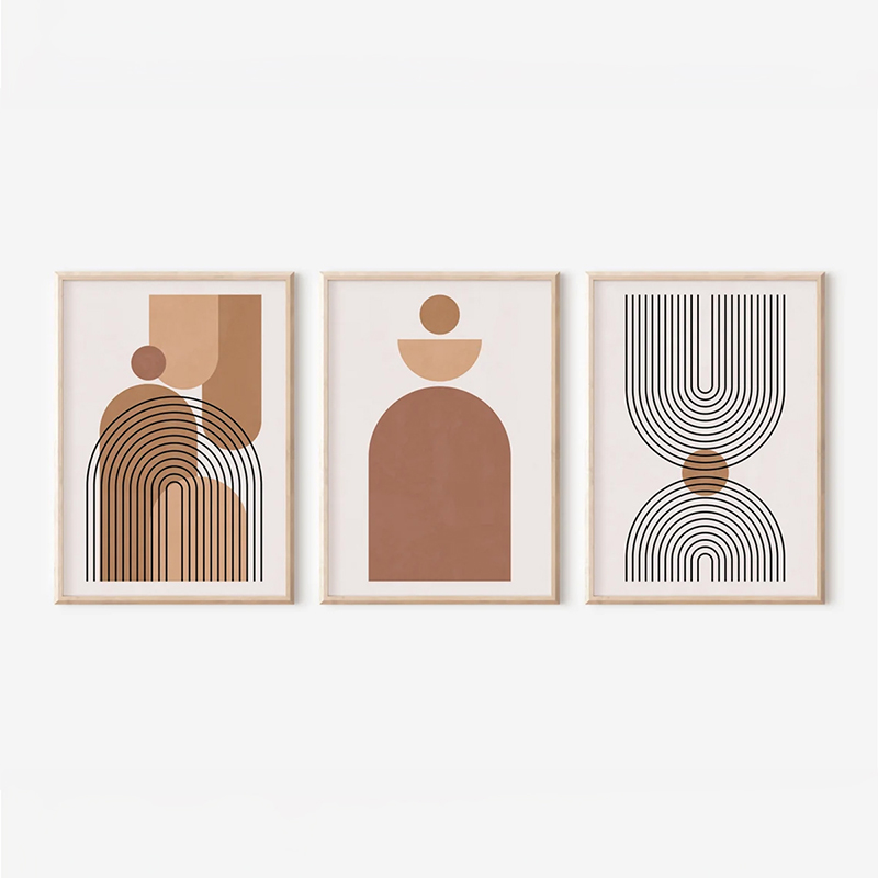 Upgrade your space with the visual power of pattern: the Rexion Triptych is the ideal piece to give your walls a minimalist, dynamic character. This three-piece composition, enhanced with high-resolution digital prints, features abstract motifs that combine clean geometric forms with bold striped lines and arches, all in a warm palette of earthy and neutral tones. Through their harmonious interaction, they create a modern, striking visual rhythm and a distinctive aesthetic statement.