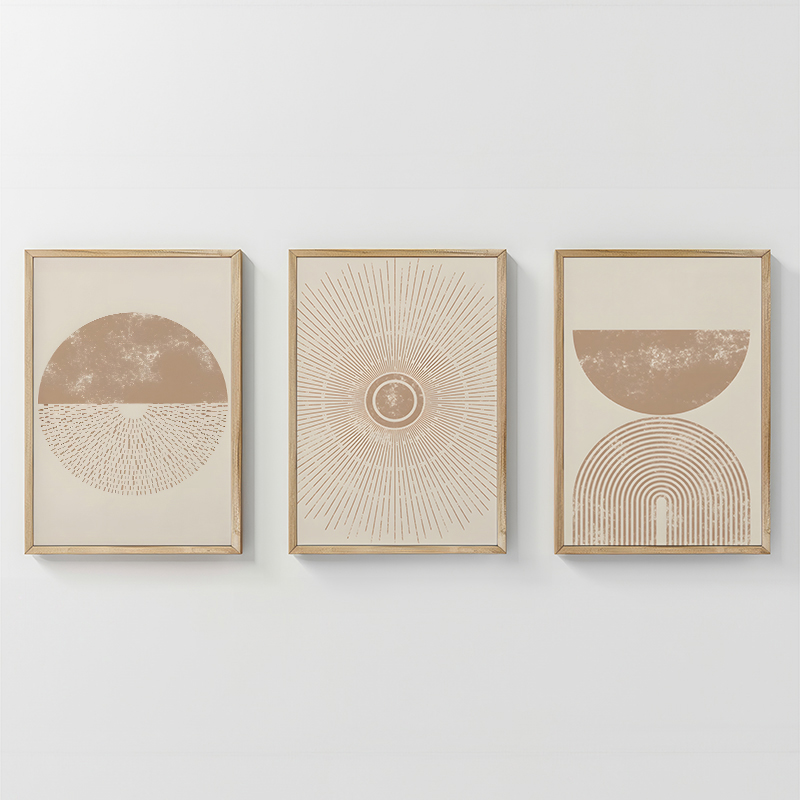 Bring into your space a high-aesthetic artwork that balances geometric precision with the warmth of earthy, neutral tones. The Varenzy triptych is an aesthetic statement consisting of three separate, interacting pieces. Each panel features abstract geometric elements—mainly semicircles and mandala-style patterns.