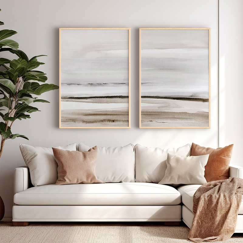 Let your gaze rest on the misty horizon and the serene calm of a minimal landscape. The Vervemy diptych is not just decoration; it is an aesthetic statement that captures the evocative beauty of a landscape where lines meet ethereal colors. Each time your eyes fall on the soft, horizontal lines and neutral tones, you feel a sense of deep calm, meditation, and perfect balance. The artwork symbolizes tranquility, simplicity, and the timeless charm of minimalism. It is a visual reminder that true luxury lies in moments of absolute serenity.