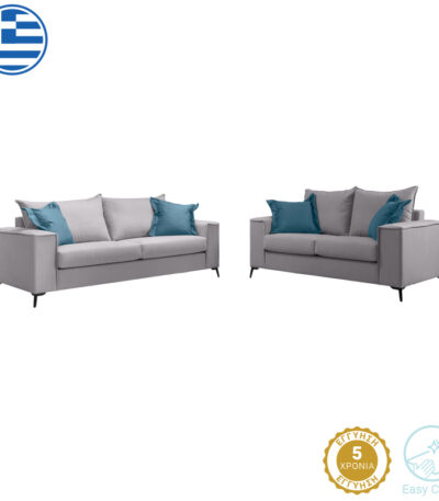 Verona 2 pieces sofa set light grey fabric with blue-colored cushions