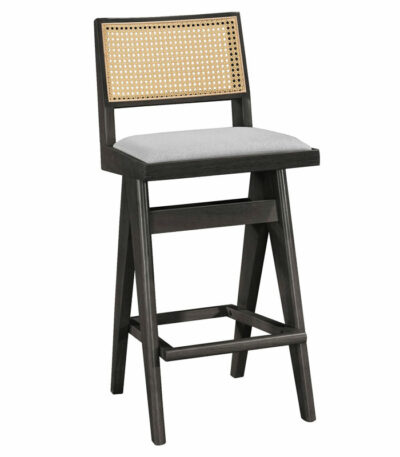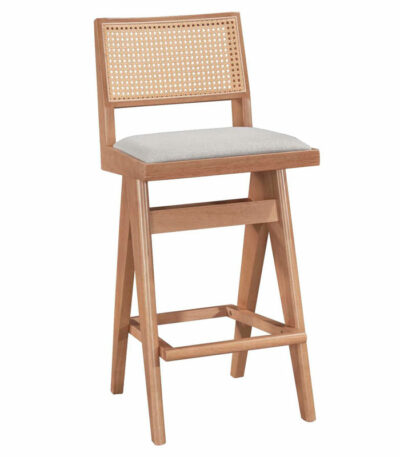 Bar stool with arms Winslow wood rubberwood light walnut-pvc rattan natural-fabric gray