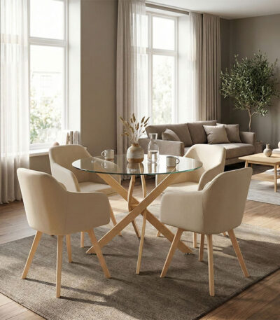 Dining Room with Safira Beige Armchairs and Antoro Glass Table D100x75cm Set of 5pcs