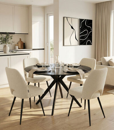 Dining Room with Renish White Chairs and Orbital Black Table D120x76cm Set of 5pcs