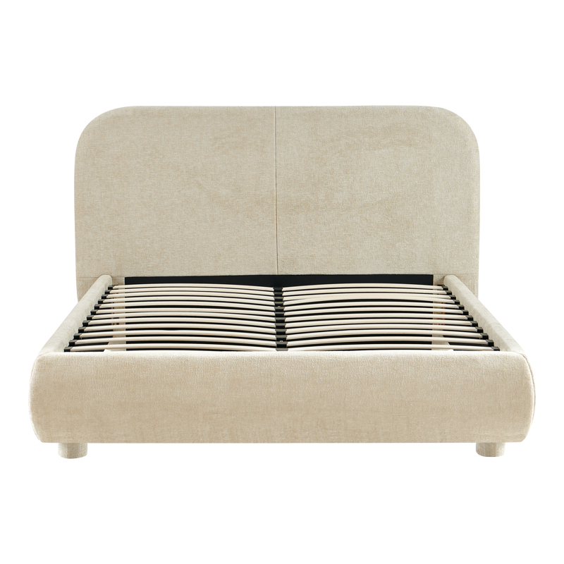 Supported by plywood wooden legs upholstered with fabric in the same color as the bed.