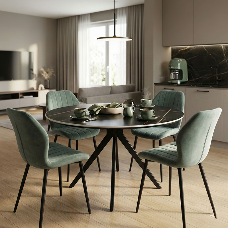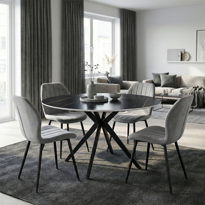 Dining Room with Jelour Grey Chairs and Orbital Black Table Φ120×76 Set of 5pcs