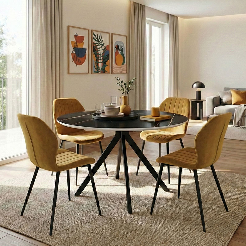 - Round tabletop with a black marble effect, resistant to daily use and easy to maintain.
