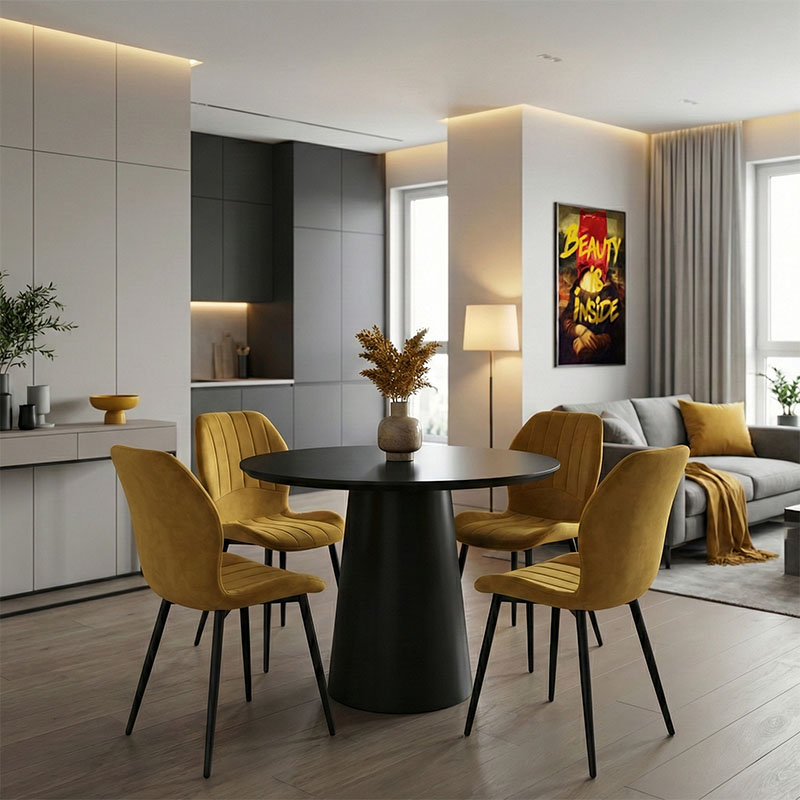 Dining Room with Jelour Yellow Chairs and Donda Table Black Φ100×76 Set of 5pcs