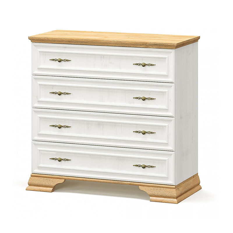 The set consists of 4 pieces: 1 bed, 2 nightstands, 1 chest of drawers