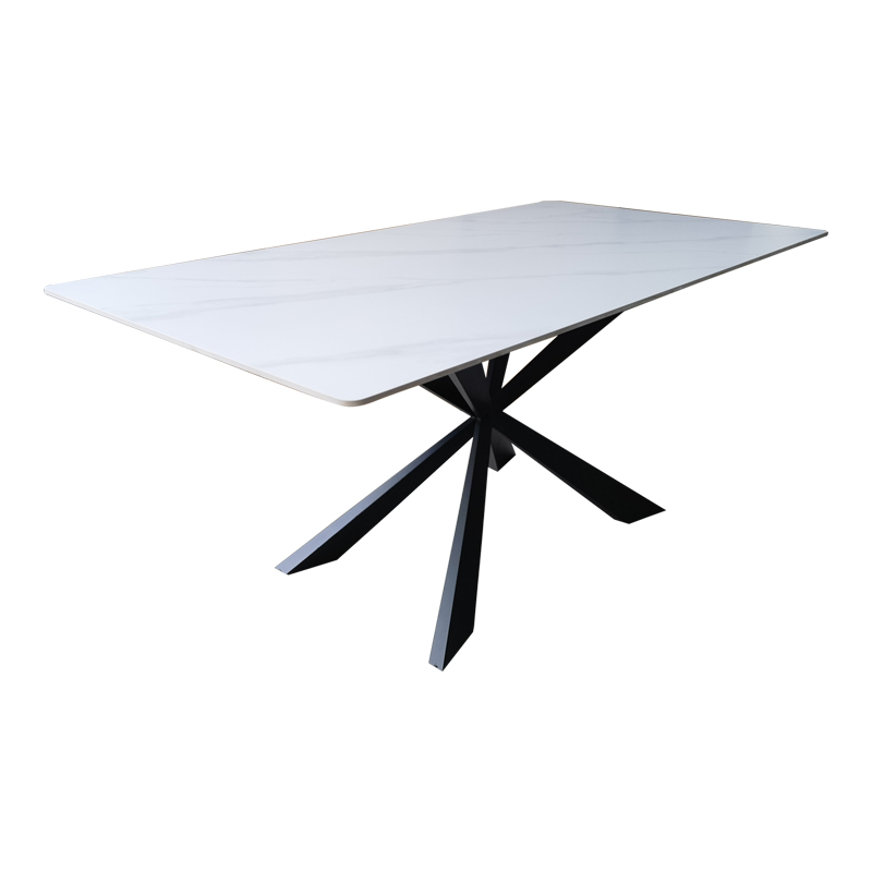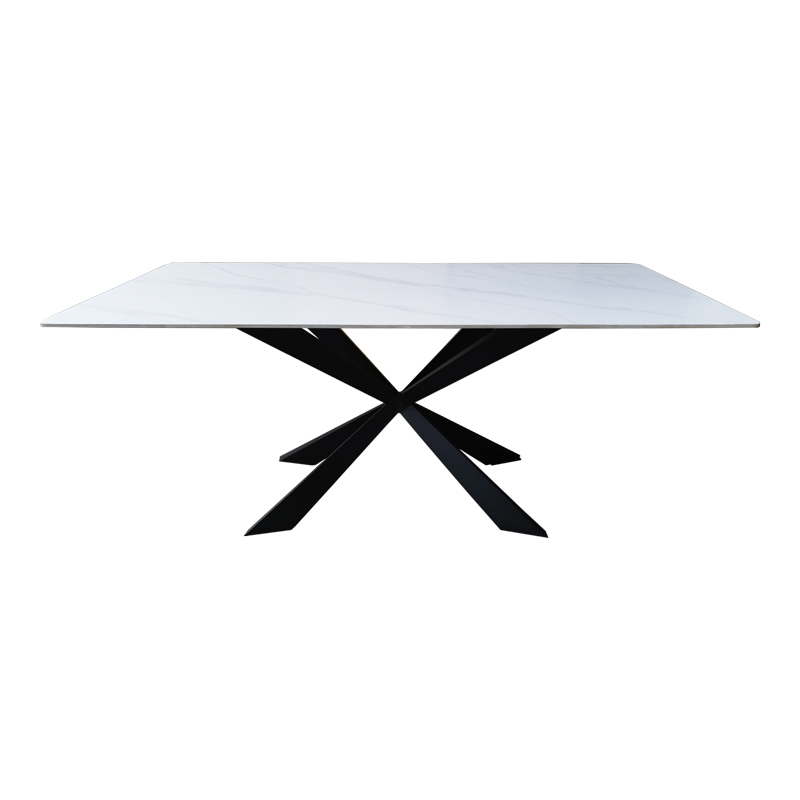 Looking for a bold statement piece to enhance your dining room or professional space? This rectangular dining table seamlessly combines the elegance of a marble-look surface with the striking, contemporary appeal of a black metal base. The unique intersecting “star base” not only provides outstanding stability but also serves as a standout architectural feature.
