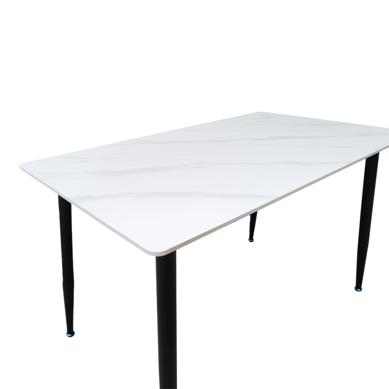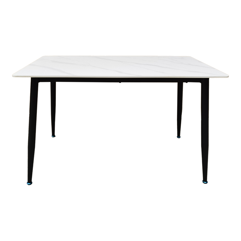 Upgrade your space with the modern and functional Pembe dining table. Its striking white marble-effect surface adds a sense of luxury and refinement, while the sleek, tapered black metal legs ensure stability and durability.