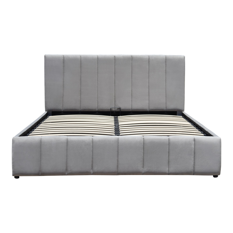 The bed features an easy-to-use mattress lift mechanism, which reveals a spacious storage area underneath. This makes it exceptionally easy to organize linens, pillows, out-of-season clothing, or other items, effectively contributing to the organization and tidiness of the space.