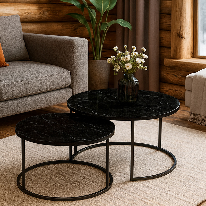 Solme coffee tables 2pcs black marble look with black metal legs