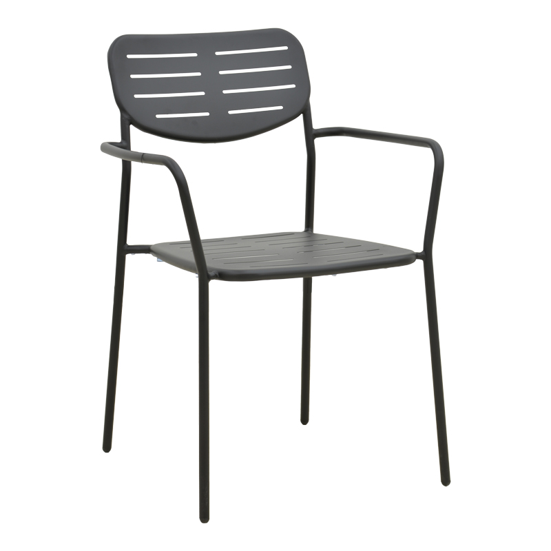 Upgrade your outdoor spaces with the Deraby armchair, designed to provide comfort and lasting durability in any condition. Its modern industrial style makes it ideal for balconies and gardens. The design is minimalist, featuring clean lines and a backrest with thin horizontal slats that allow ventilation, while the comfortable armrests enhance relaxation.