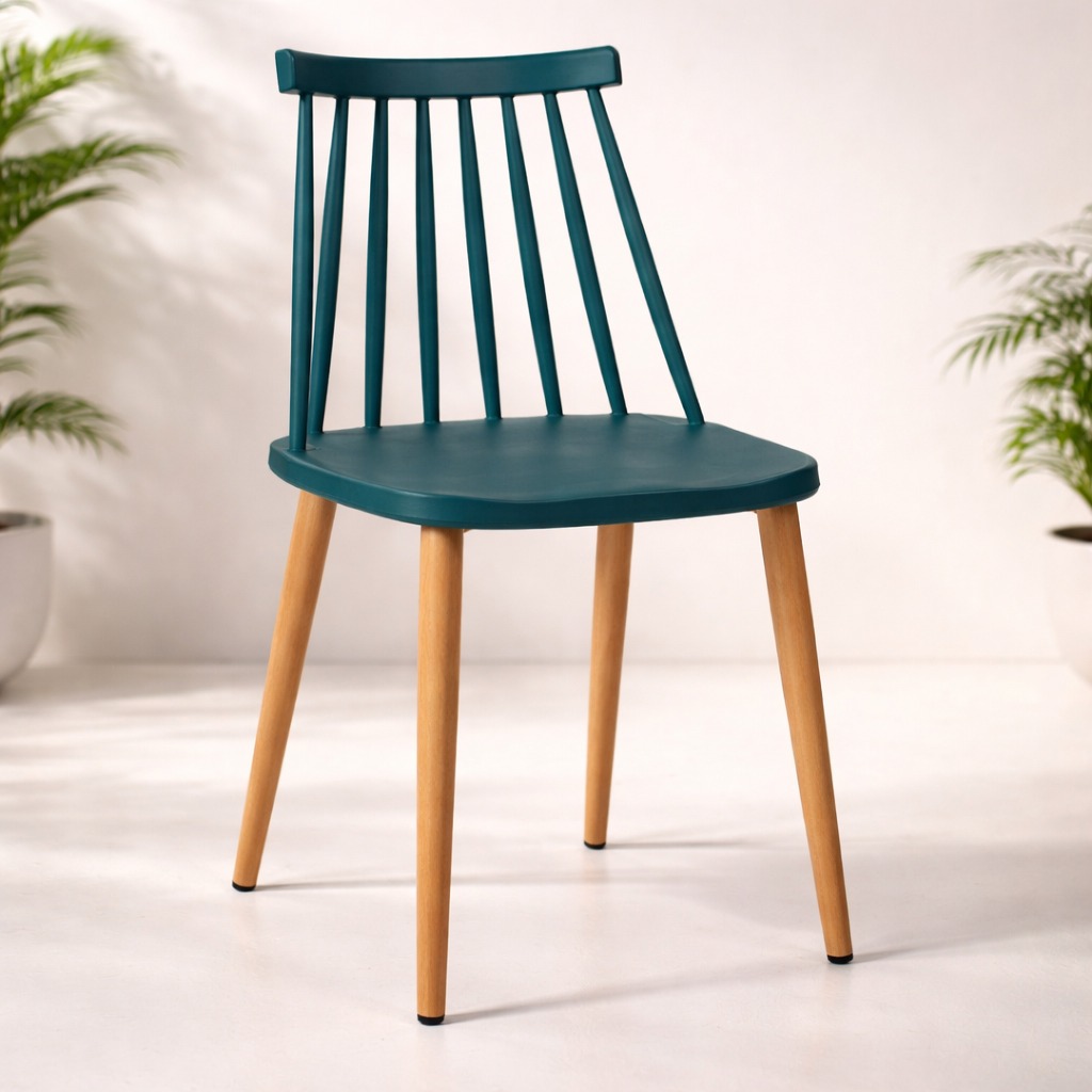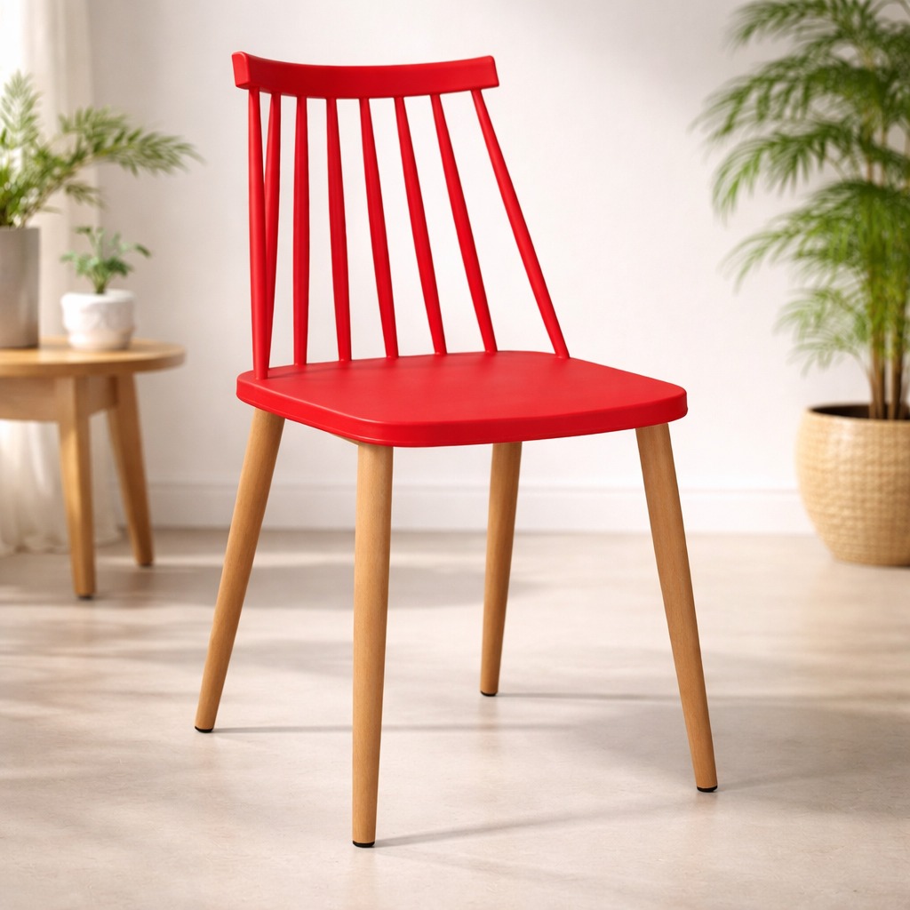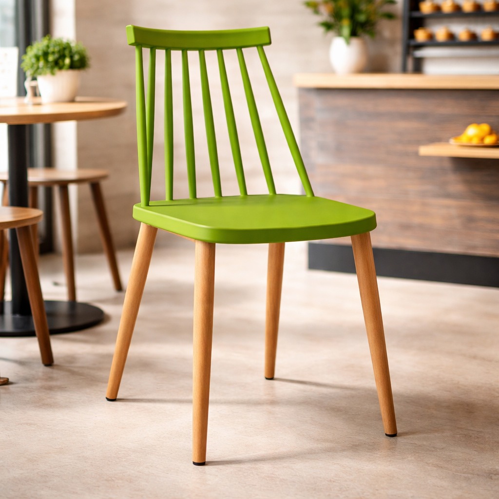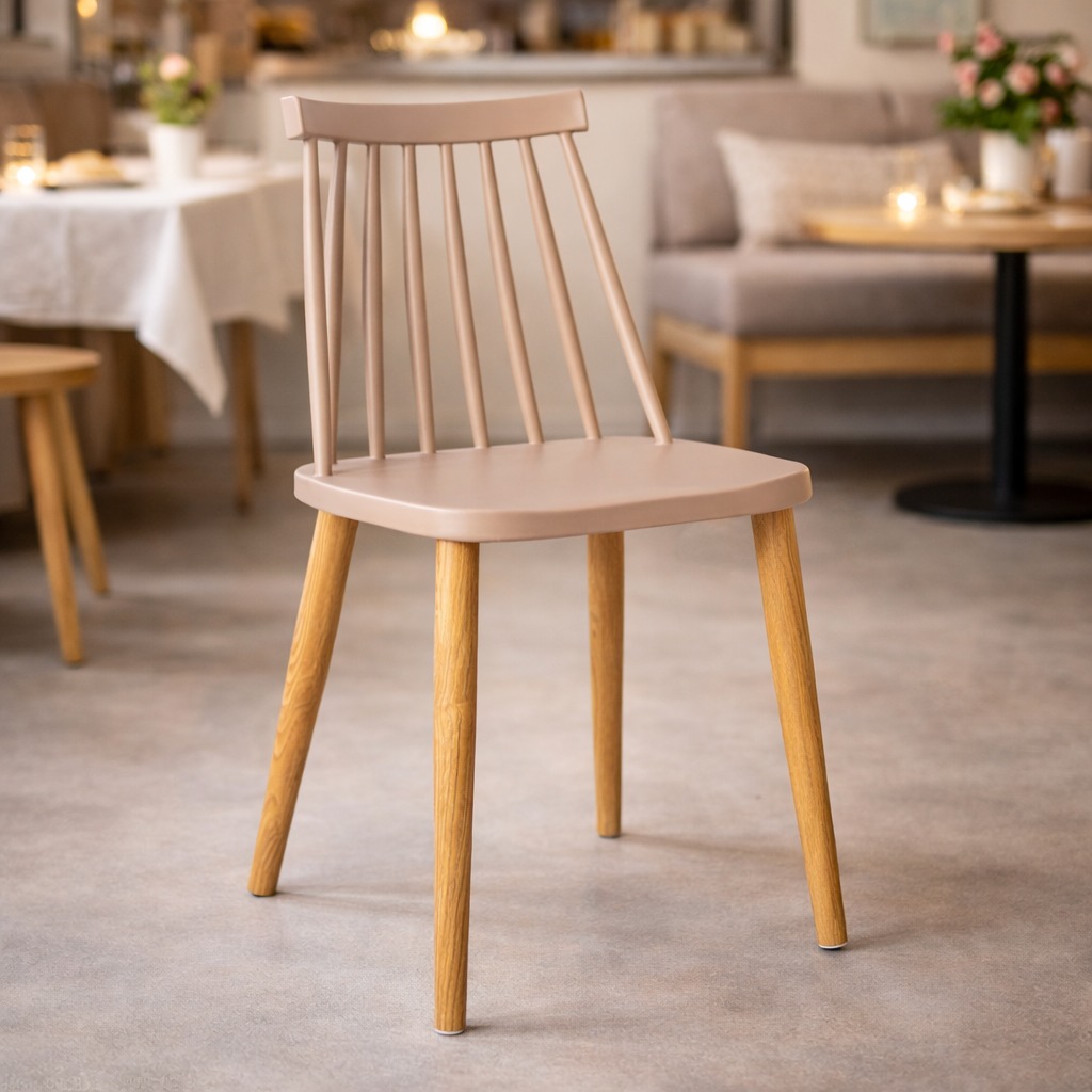 Седиштето е изработено од квалитетен полипропилен – материјал кој е лесен за одржување и отпорен на абење, додека металните ногарки со финиш во боја на дрво обезбедуваат стабилност и модерен изглед.