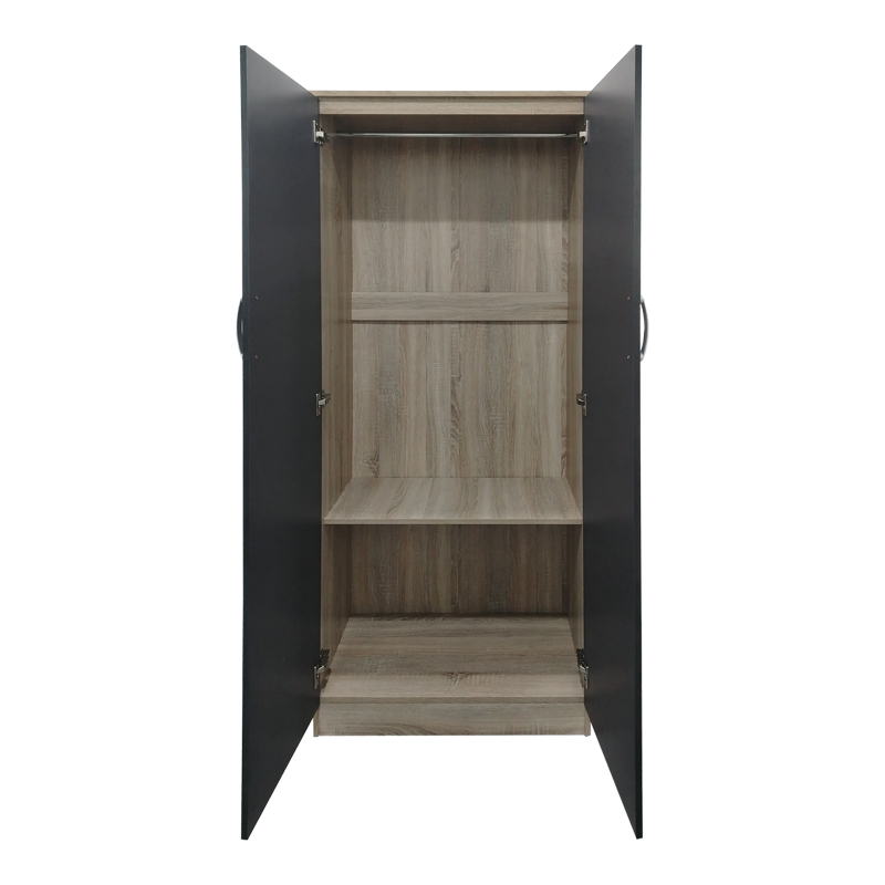 • It features two doors, an internal rail for hangers, and a bottom shelf for organizing clothes and accessories.