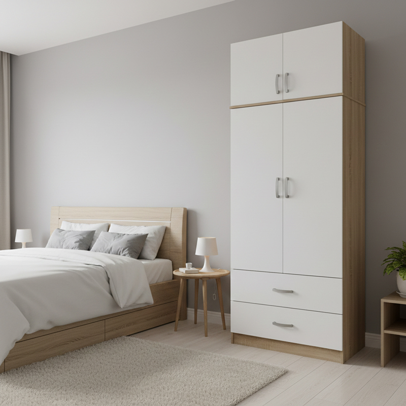 Two-door wardrobe with 2 drawers and loftAthos in oak-white color 80x42x240cm