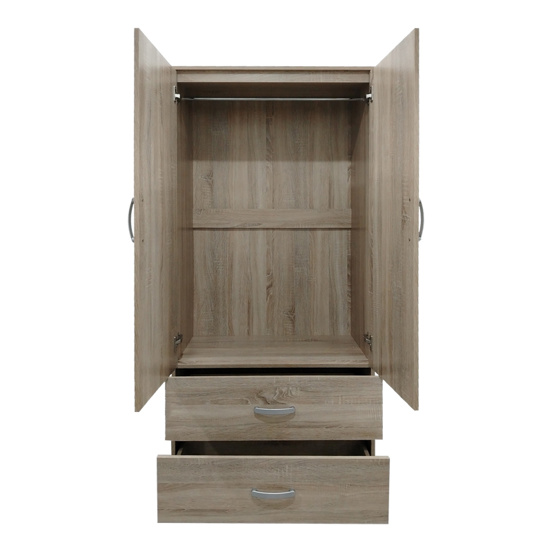 - Features two doors with an internal hanging rail for clothes, as well as two spacious bottom drawers for storing garments and accessories.